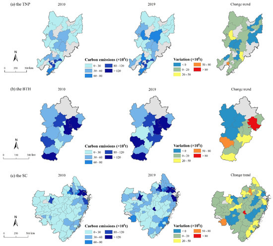 From 2010 to 2019, 70.3% of the cities within the study area exhibited an upward trend in CEs (Figure 8). Conversely, 29.7% of the cities experienced a decline in CEs, with these reductions primarily observed in the SC and the TNP, including major urban centers such as Shanghai, Hangzhou, and Xiamen. In the TNP, areas with high CEs are relatively scarce, mainly distributed in the southern part of Liaoning Province, while CEs in Jilin and Heilongjiang Provinces are relatively low (Figure 9). Moreover, 32% of the cities in the TNP show a trend toward negative growth. In the BTH, several cities have experienced a decline in CEs, particularly in Beijing and its surrounding areas. In the SC, high-value carbon emission areas are predominantly located in the northern and eastern coastal zones. Approximately 18.3% of cities demonstrate a decreasing trend, mainly distributed across Zhejiang and Jiangxi provinces.