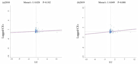 Figure 10 demonstrates that Moran’s I of LU and CEs under the three weight matrices is statistically significant, with positive coefficients. This suggests a pronounced positive spatial correlation for both LU and CEs, where the Moran’s I of CEs significantly exceeds that of LU. Figure 11 presents the bivariate Moran’s I scatter plot between LU and CEs, showing no statistically significant p-value in 2010, while a significant p-value (0.049) was identified in 2019. Therefore, it is necessary to apply spatial econometric models to further examine the spatial relationship.