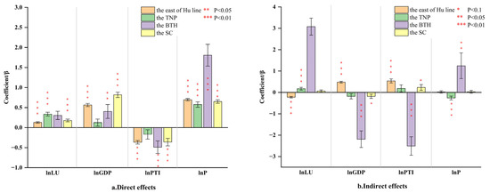 Through the spatial econometric analysis, it is evident that the impact of LU on CEs exhibits significant regional disparities (Figure 13). For detailed results, please refer to Appendix A. Whether considering the direct effect or the indirect effect, the level of LU in the TNP is significantly positive. Specifically, the direct effect coefficient is 0.336 and statistically significant at the 1% level, while the indirect effect coefficient, slightly smaller than the direct effect, is 0.174 and also statistically significant at the 1% level. In the SC, the direct effect of LU on CEs is significant, while the indirect effect coefficient is not significant. The direct effect coefficient is 0.177, which is significant at the statistical level of 1%. It is worth noting that in the BTH, the impact of LU on CEs is not significant either directly or indirectly.
