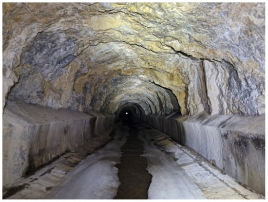 GS6 Tunnel Orenburg, Markušovce (Figure 5)—it is a 550 m long tunnel at an altitude of 470 m a.s.l. It was dug by miners in the limestone massif of the Hôrka hill to divert the water of the Markušovský potok stream into the neighboring valley of Korytné. The reason for the tunneling and the diversion of Markušovský potok was the expansion of the Markušovce tailings impoundment. The tunnel was completed in 1975. It is passable, and it is a tourist attraction. At the bottom of the tunnel, there is an artificial concrete basin that joins the stream in the Korytné valley. Trout live in the water flowing through the tunnel, and the body of the tunnel itself is a habitat for various species of spiders, gastropods, reptiles and bats.