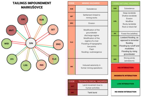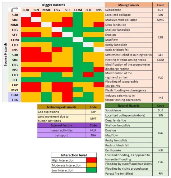 In this methodology [], we used two tools: the matrix of interaction and the interaction diagram, which complement each other. The process of preparing for a multi-hazard assessment is divided into three main steps. In the first step, three major groups of hazards are described: mining, natural and technological. The second step deals with the potential interaction based on the common factors of hazards and the conditions of occurrence of hazards. Interactions between hazards are based on their nature—triggering or aggravating. We can visualize potential interactions using both tools: an interaction matrix and an interaction diagram. The third step is aimed at identifying the level of interactions between hazards. The level of interaction is based on the intensity of each hazard and their level of interaction.