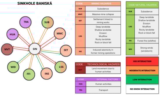 For the assessment of the study area, we used the multi-hazard interaction matrix tool, which allows us to visualize the interactions between individual hazards and also to consider the level of interaction. As this is a mining landscape, we identified mining hazards as triggers. At the same time, we also considered external factors, namely the human factor and the technical infrastructure, specifically transport (Figure 6).