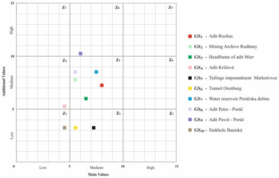 The highest total point value (16.25) is achieved by GS9 Pavol adit in Poráč. Within the matrix, it is located in field Z8, which represents a high level of additional and medium level of main values. The geosite scored particularly highly within the VTr. It is part of the compound of the Mining Museum in the Poráčska dolina valley, easily accessible to tourists, and includes a guided tour. The necessary tourist infrastructure (accommodation, catering facilities, parking, wellness, resting places, etc.) is located in close proximity. The entrance to the adit has been renovated and the route is easy and safe. There are also educational boards near the adit, forming part of the Mining Nature Trail. Organized visits arranged by telephone are popular and, during the summer months, a guide is available in the building of the Mining Museum compound. The disadvantages of the geosite (reflected in the lower scores for the main values) are the remoteness of the main transport routes, the small area of the geosite for a large number of visitors and the existence of several similar geosites in the region.