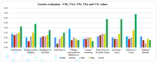 Thus, the main values group (VSA, VSE, VPr) included 15 indicators and the additional values group (VFn, VTr) also included 15 indicators (Table 1). Thus, each of the 10 monitored geosites was assessed using 30 indicators, each of which was assigned a score value ranging from 0 to 1 on a numerical scale of 0–0.25–0.5–0.75–1.0. The resulting total value of the observed geosite was calculated based on the following formula: