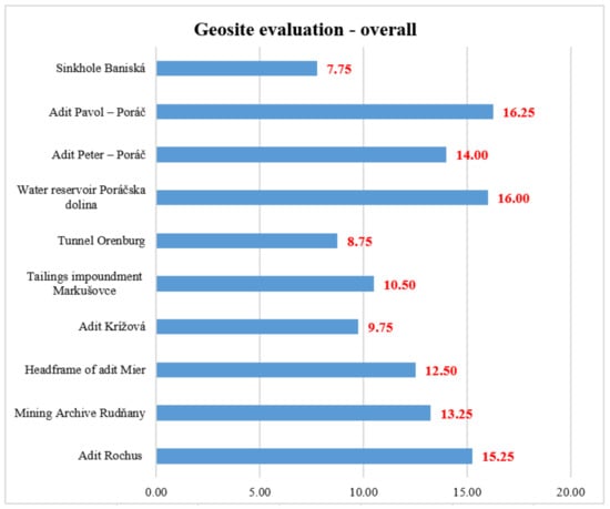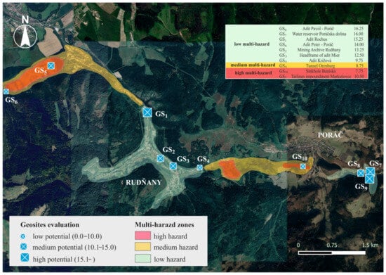 Based on the results of the assessment of the potential of individual geolocations for geotourism (Table 2, Figure 9, Figure 10 and Figure 11) using the GAM methodology, the following facts can be stated. Three geosites have high potential (15.1 p. and more) in the assessed area, namely GS9 Pavol adit, Poráč with 16.25 points (p.), GS7 Poráčska dolina reservoir with the value of 16.00 p. southeast of the village of Poráč and GS1 Rochus adit (15.25 p.) to the north of Rudňany. Two geosites directly in the residential area of Rudňany—GS2 Mining Archive Rudňany (13.25) and the nearby GS3 headframe of Mier adit (12.50), as well as GS8 Pavol adit, Poráč (14.00) in Poráčska dolina and GS5 tailings impoundment of Markušovce in the western part of the area—all have medium potential (10.1–15.0 p.) for geotourism. Low potential (0–10.0 p.) was recorded by GS10 Baniská sinkhole (7.75) to the south of Poráč, GS6 Tunnel Orenburg (8.75) near the tailings impoundment of Markušovce and GS4 Krížová adit (9.75) in Rudňany.