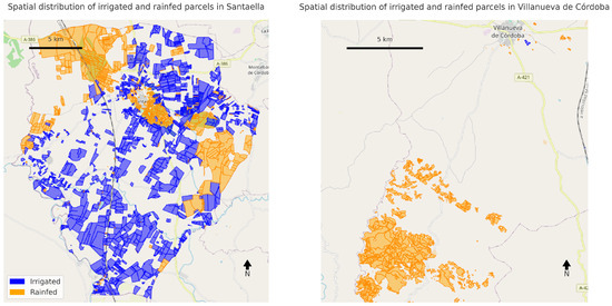In Santaella, parcel sizes ranged from 0.0017 ha to 169.64 ha, with a mean area of 3.68 ha and a median of 1.04 ha. In Villanueva de Córdoba, parcels ranged from 0.0026 ha to 107.64 ha, with a mean of 2.08 ha and a median of 0.50 ha. When considering irrigation status, irrigated parcels generally exhibited larger mean areas (3.81 ha) compared to rainfed parcels (2.80 ha), reflecting the typical trend of larger parcel consolidation under irrigation schemes. These size distributions reflect the typical heterogeneity of olive groves in Andalusia.
