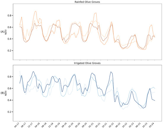 NDVI time series for rainfed (A) and irrigated (B) olive groves, illustrating temporal differences in vegetation dynamics. Orange lines depict three randomly selected rainfed parcels whereas blue lines depict three irrigated parcels.