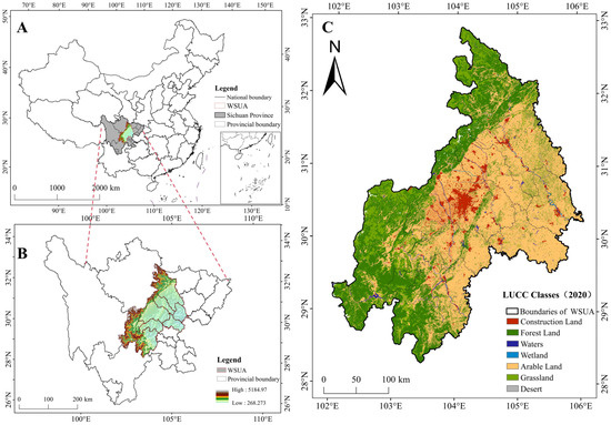 Location map of the WSUA. (A) Location of WSUA in China. (B) Location of WSUA in Sichuan Province. (C) WSUA 2020 land use types.