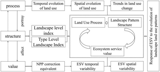 Based on the above considerations, we selected land use, landscape pattern, and ESV as representative indicators of process, structure, and value, respectively. The research framework of this study comprises three components. First, the “process” component utilizes remote sensing imagery from 2000 to 2020 and applies spatial statistical analysis and transition matrix methods in ArcGIS 10.2 to analyze land use change processes. The “structure” component is represented by landscape metrics calculated using Fragstats 4.2, including patch density (PD), mean patch size (MPS), edge density (ED), aggregation index (AI), landscape shape index (LSI), Shannon’s diversity index (SHDI), division index (DIVISION), and contagion index (CONTAG). Second, the “value” component explores the spatiotemporal evolution of ESV based on land use data from 2000 to 2020, employing a modified equivalent factor method. Finally, to capture the dynamic coupling relationships among “process–structure–value”, we developed a land use process–ESV response model (Figure 3).