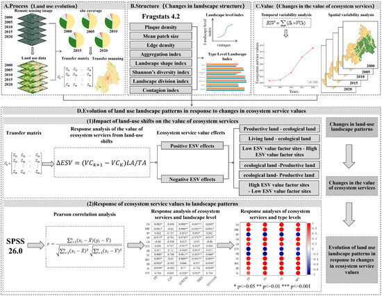 Technical route and research methodology. (A) Process (Land use evolution). (B) Structure (changes in landscape structure). (C) Value (changes in the ESV). (D) Evolution of land use landscape patterns in response to changes in ESV.