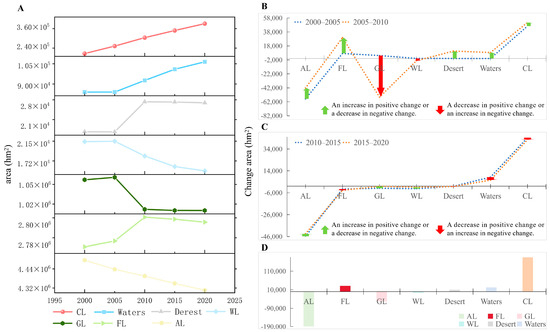 Changes in the area of land use types in WSUA from 2000 to 2020. (A) Land use change by category, 2000–2020. (B) Characteristics of changes in various types of land use, 2000–2010. (C) Characteristics of changes in various types of land use, 2010–2020. (D) Characteristics of overall changes in multiple types of land use, 2000–2020.