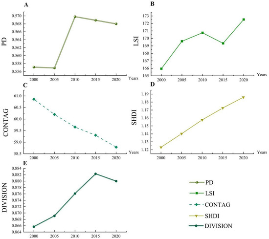 Changes in landscape level index of WSUA from 2000 to 2020. (A) Changes in patch density in WSUA, 2000–2020. (B) Changes in landscape shape index of WSUA, 2000–2020. (C) Changes in contagion index of WSUA, 2000–2020. (D) Changes in Shannon’s diversity index of WSUA, 2000–2020. (E) Changes in landscape DIVISION of WSUA, 2000–2020.