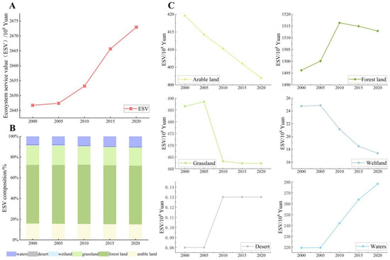 Changes in ESV for WSUA in general and for each land type. (A) Changes in the Total ESV, 2000–2020. (B) Percentage of ESV by land use type, 2000–2020. (C) Changes in the ESV by land use type, 2000–2020.