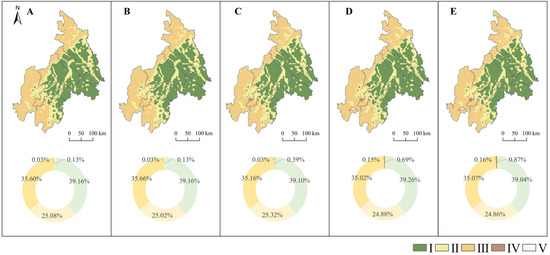 Spatial distribution of ESV in WSUA, 2000–2020. (A) Spatial characteristics of ESV, 2000. (B) Spatial characteristics of ESV, 2005. (C) Spatial characteristics of ESV, 2010. (D) Spatial characteristics of ESV, 2015. (E) Spatial characteristics of ESV, 2020.