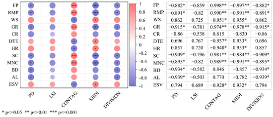 A more fragmented landscape pattern was associated with higher total ESV. Total ESV showed a strong positive correlation with SHDI and a strong negative correlation with CONTAG. Specifically, strong correlations were observed among landscape metrics (PD, DIVISION, SHDI, CONTAG) and various ecosystem service functions. PD and DIVISION exhibited significant negative correlations with FP, RMP, GR, MNC, BD, and AL. Conversely, CONTAG was significantly positively correlated with FP, RMP, GR, and SC, but negatively correlated with WS, DTE, and HR. Similarly, SHDI was positively correlated with WS, HR, and DTE, but negatively correlated with FP, RMP, GR, SC, and also DTE (Figure 11).