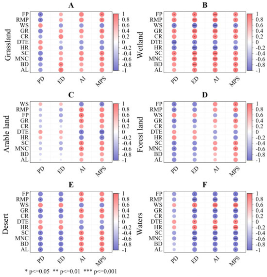 The findings indicate that the increased connectivity of similar landscape patches is crucial for enhancing ESs, especially in ecological lands. The MPS of forests and grasslands was strongly positively correlated with various ecosystem service functions, including FP, RMP, GR, SC, and MNC. The AI of arable land was significantly positively correlated with FP, RMP, GR, SC, and MNC, but significantly negatively correlated with DTE. The PD and ED of deserts were significantly negatively correlated with RMP, GR, SC, MNC, BD, and AL. The ED and AI of waters were significantly positively correlated with HR, WS, and DTE. The PD, ED, AI, and MPS of wetlands were significantly positively correlated with FP, RMP, GR, SC, and MNC (Figure 12).