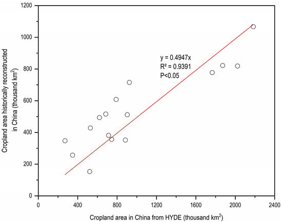 The HYDE, with its extensive temporal coverage (10,000 BC–2000 AD), offers distinct advantages for long-term studies. In this study, a regression model was established between the cropland areas in China derived from the historical data and those extracted from the HYDE, in order to calibrate the cropland area for the LP.