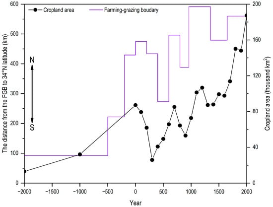 Further confirming the numerical accuracy of the calibration, the calibrated cropland area of the LP in 2000 AD (187.3 thousand km2) closely matches the remote sensing data at a 30 m × 30 m resolution [43], which is 192.9 thousand km2. Additionally, based on the spatial map of the FGB (Figure 4), we calculated the distance from the boundary to the 34° N latitude and found that it fluctuated synchronously with the cropland area (Figure 3). The LP, being suitable for both farming and grazing, reflects the shifting balance of agricultural and pastoral forces through the movement of the FGB [30]. Therefore, the north–south movement of the FGB indicates changes in the extent of the agricultural land or cropland area.