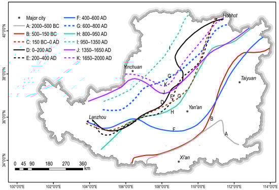 There were three methods used for obtaining population data: (1) direct acquisition, which was used for the following years: 2000–771 BC, 2 AD, 140, 280, 609, 742, 1291, 1820, 1840, 1873, 1911, 1928, 1949, and 2000 AD [9,32,33,34]; (2) aggregating population data from published works on counties in Ningxia, Shanxi, Shaanxi, Gansu, and Inner Mongolia, located in the LP, for the years 340, 202 BC, 639 AD, 983, 1102, 1207, 1330, 1381, 1578, and 1661 AD [35]; and (3) since the LP largely encompasses the middle reaches of the YR (estimated to cover ~70% of its drainage area based on our geospatial analysis), it was assumed that the population ratio between two adjacent periods in both regions remained constant. Based on this assumption, the population for the LP in 25 AD, 105, 581, and 934 AD was estimated by multiplying the population ratio of the middle YR for each of these years and the preceding year (when both the LP and the middle YR have population data for the same years) with the population of the LP for preceding year [29]. The population data for the middle YR were sourced from the study ‘Research on Environmental Evolution and Sediment Transport Patterns in the Yellow River Basin’ [36].