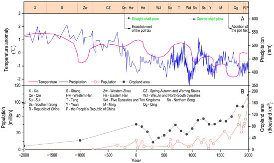 The population of the LP fluctuated cyclically with dynastic changes, but shows an overall exponential growth over time (y = 3.05 exp(0.0011t); R2 = 0.75; p < 0.05; where t represents the time and y represents the population). This growth can be divided into three main stages: stagnation (2000–500 BC), fluctuating changes (500 BC–1400 AD), and linear growth (1400–2000 AD), with average population levels of 0.377, 6.86, and 33.43 million, respectively (Figure 5B). The head tax system was introduced during the Western Han Dynasty (202 BC–8 AD) and abolished during the Qing Dynasty (1644–1911 AD) (Figure 5A). The straight-shaft plow and oxen-drawn plowing were introduced during the Western Han Dynasty, and later replaced by the curved-shaft plow during the Northern Song Dynasty (960 AD–1127 AD) (Figure 5A). The annual rainfall and temperature declined linearly over time, at rates of 2.8 mm/100 years and 0.05 °C/100 years, respectively (Figure 5A). The rainfall for 2000 BC to 290 BC was significantly higher than that for 290 BC to the present (526.8 mm vs. 438.9 mm, p < 0.05), and while the rainfall fluctuated after 290 BC, there was no significant declining trend (p > 0.05). The temperature fluctuated until 1000 AD, then dropped rapidly at a rate of 0.11 °C/100 years from 1000 AD (p < 0.05), with warming beginning in the 1850s.