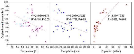The relationship between the cropland area and temperature, rainfall, and population of the LP.