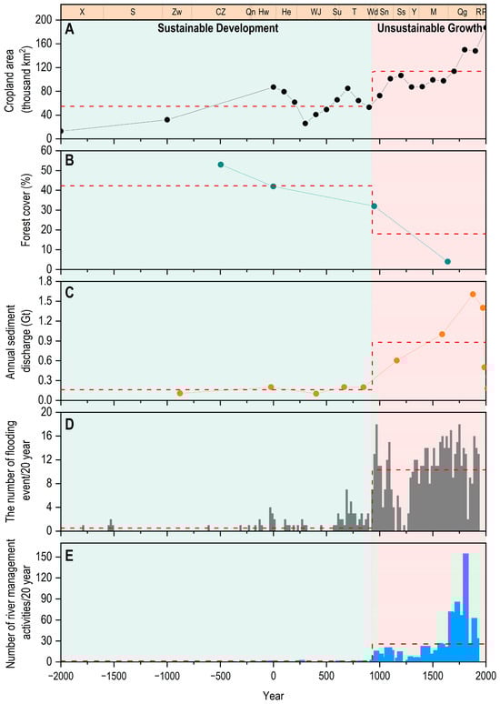 Social–ecological effects induced by cropland area changes. (A) Cropland area of the LP. (B) Forest cover of the LP. (C) Annual sediment load of the YR. (D) Flooding frequency of the lower YR. (E) The frequency of river management activities for the lower YR. The light green area (left) in the figure indicates the sustainable development phase of the social-ecological system, while the pink area (right) represents the unsustainable development phase.
