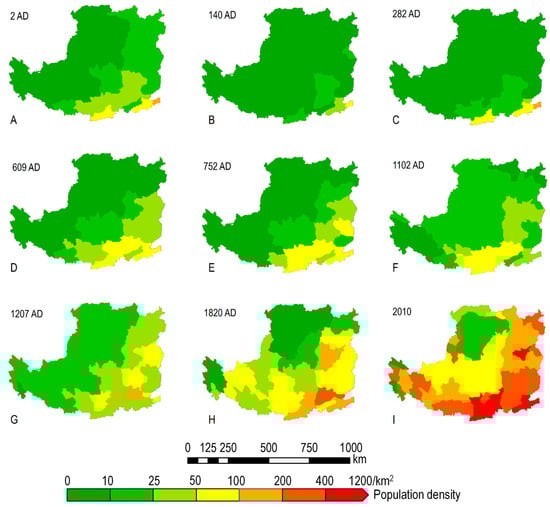 The cropland grid data are from the HYDE version 3.1 dataset, developed by the Netherlands Environmental Assessment Agency. The dataset covers the time range from 10,000 BC to 2000 AD, with a spatial resolution of 5′ × 5′ and temporal resolutions of 1000 years before 0 AD, 100 years between 0 and 1700 AD, and 10 years from 1700 to 2000 AD. The dataset can be downloaded from http://themasites.pbl.nl/en/themasites/hyde/download/index.html (accessed on 1 October 2024). The procedure for acquiring the cropland area in this study consisted of three steps [29]: (1) Extracting the cropland area from the HYDE dataset. Geographic registration was performed using the LP and China’s geographical boundaries, counting the number of cropland grid cells within these boundaries and multiplying by the area of a single grid cell to calculate the cropland area for different periods in the LP and China. (2) Establishing a functional relationship (using linear regression) between the cropland area derived from the HYDE dataset and historical literature estimates for China. (3) Using this functional relationship to adjust the cropland area in the LP as provided by the HYDE dataset. The cropland area for different periods in China was derived from previous research (Table 1).