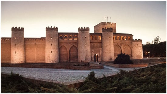 - Beltrán, A. Introducción. In La Aljafería; Martín, M.A., Ed.; Cortes de Aragón: Zaragoza, Spain, 1998; pp. 17–33. [Google Scholar]