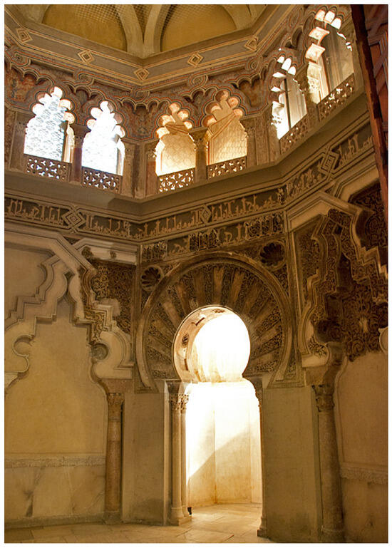 - Planeta Sapiens. Mihrab en el Oratorio del Palacio de la Aljafería, Zaragoza. Flickr. Available online: https://www.flickr.com/photos/planetasapiens/6813117627/ (accessed on 11 January 2025).