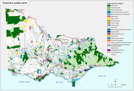 - VEAC. Statewide Assessment of Public Land Discussion Paper for Public Comment; Victorian Environmental Assessment Council: Melbourne, Australia, 2016. [Google Scholar]