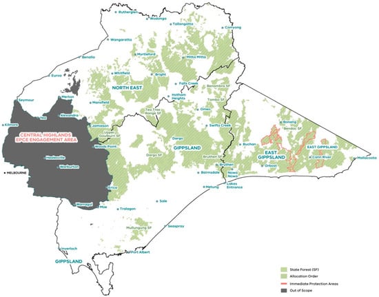 The first process was the Eminent Panel for Community Engagement, announced in 2021 to provide recommendations on the future use of state forest areas in the Central Highlands and Immediate Protection Areas. In August 2022, the Eminent Panel for Community Engagement [25] completed its “Future Use and Management of Mirboo North and Strathbogie Ranges Immediate Protection Areas” and focused its work on the future use of state forests in the Central Highlands (Figure 2) with consultation closing in July 2024. The Eminent Panel commissioned VEAC to prepare an “Assessment of the values of state forests in the Central Highlands” [26] to help inform the process. At the time of writing, no recommendations on future land use have been made in this specific area.