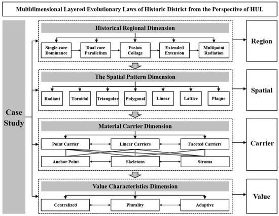The theoretical framework of this study is rooted in the concept of urban historic landscape, and it employs a four-dimensional analysis system to examine the layering law of historic districts. This approach unveils the evolutionary trajectory of historic districts. The following sequence of logical links is proposed: The historical area dimension serves as the geographic foundation for spatial evolution, emphasizing the dynamics of spatial boundaries and the functional radiation effect of the historic district. This dimension unveils the logic of expansion and contraction of the “core–edge” structure across the temporal axis. The spatial morphology dimension identifies the genetic and mutation mechanisms of spatial genes through the comparison of axes, texture, and scales in the past. This dimension quantitatively characterizes the rupture and continuity of the morphological layer. The second dimension pertains to spatial morphology, which is characterized by the comparison of axes, texture, and scale over time. This facilitates the identification of the genetic and mutation mechanisms of spatial genes. Furthermore, it enables the quantitative characterization of the fracture and continuity of morphological layers. The third dimension concerns the material carrier, and it involves the establishment of an analytical model of “anchor point-–skeleton–substrate network” through analysis. The fourth dimension relates to value characteristics, and it integrates the symbiotic evolution logic of cultural, social, and economic values. Additionally, it summarizes the evolution law of value characteristics. The research framework innovatively extends the operational dimension of the HUL theory from the “identification of conservation objects” to “decoding of evolution laws”, maintaining the systematicity of historical elements and strengthening the interpretability of dynamic evolution.