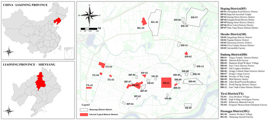 (4) The feasibility of data collection is a pivotal consideration in the research design. Subject to the constraints of research resources, the selection of the 10 historic districts is informed by the “completeness of historical data” and “accessibility of field research”. However, given that certain industrial heritage-type historic districts in Shenyang are still in the production stage (e.g., Locomotive Signal Factory), are classified units (e.g., Shenyang Aircraft Factory, Mint), or are military management areas (e.g., Dongji Factory), it is not possible to ensure the legitimacy and reliability of the research data through field survey work.