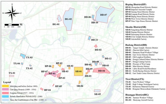 The present study is underpinned by official documents made public by the Natural Resources Bureau of Shenyang City and field surveys conducted by the author, who has identified 30 historic districts within the city’s current borders. These districts encompass a variety of historical periods, including the Qing Dynasty, the Republic of China, the colonial period, and the period of planned economy (Table 1).
