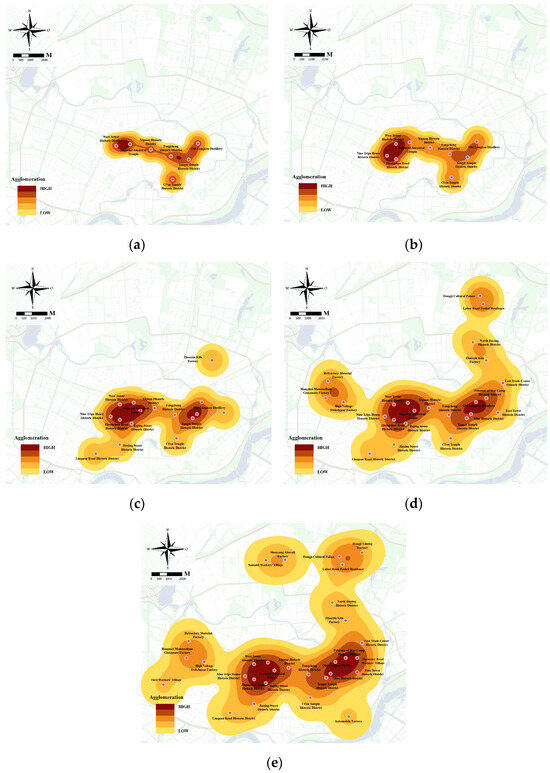Kernel density analysis is a spatial analysis tool that reveals the spatial aggregation and distribution law of resources by evaluating the density distribution of a specific object (e.g., buildings, roads, historical sites, etc.) in geographic space. In the context of investigating layering laws, the integration of data pertaining to historical and cultural resources present within historic districts across diverse temporal periods facilitates the revelation of spatial aggregation and distribution patterns. This, in turn, enables further analysis of these layering laws [36]. The process of kernel density analysis entails the calculation of density within a specified range around a given point (e.g., historical buildings, landscape structures, landmark monuments, etc.). Utilizing ArcGIS(10.7) software, the process entails the collection of spatial data and their subsequent transformation into a different format [37]. Thereafter, the selection of the spatial analysis tool and the establishment of analysis parameters are crucial steps in generating a density map or a heat map. The analysis of kernel density in different periods facilitates the identification of historical neighborhoods that have undergone processes of expansion, contraction, and reorganization, as well as changes in spatial distribution. It also provides an effective means of identifying the spatial distribution pattern of resources in historical neighborhoods, thus offering a quantitative basis for the study of the layering law of historical neighborhoods [38]. The method is both intuitive and visual, and it is capable of quantifying the spatial distribution information of historic districts. Furthermore, it is applicable to different scales and types of spatial data of historic districts.