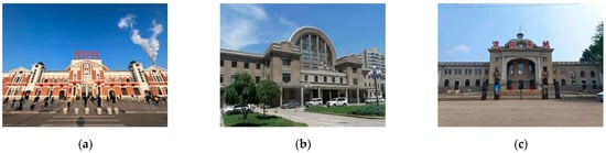 The railway station as the anchor point in the Shenyang historic district: (a) Shenyang Station; (b) Liaoning Main Station; (c) Shenyang East Station. (Source: (a) Photographs by W.Y.; (b,c) from Shenyang Cultural Conservation Association).