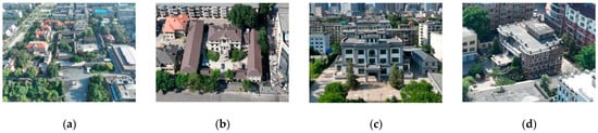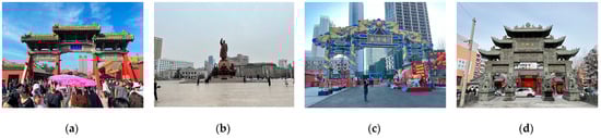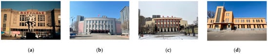 Shenyang historic district anchor point of the palace of culture: (a) Tiexi Workers’ Cultural Palace; (b) Santaizi Workers’ Cultural Palace; (c) Harmony Road Workers’ Cultural Palace; (d) Dongji Cultural Palace. (Source: (a) from Shenyang Archives; (b–d) Photographs by W.Y.).