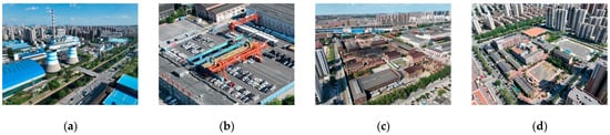 The evolution of Shenyang’s urban landscape has been profoundly influenced by the advent of industrialization, marked by the development and construction of industrial zones in various districts, including Tiexi, Dadong, and Shenhai, among others. This transformation has led to a notable shift in the city’s core functions, transitioning from its traditional role as a political and cultural hub to a prominent industrial and economic center. This transformation is not merely an extension of the city’s historical boundaries; rather, it is a profound functional reorganization and social change driven by the early stages of industrialization. As illustrated in the accompanying figure, the industrial heritage-type historic districts in this period were primarily concentrated in the Tiexi and Dadong districts, following the trajectory of the railroad traffic line and featuring factory facilities arranged centrally. This expansion pattern deviates from the conventional compact spatial configuration, giving rise to extended and diversified spatial forms. Illustrative of this transformation are the high-voltage switch factory, the refractory material factory, and other historical districts, which embody the hallmarks of the industrial era (Figure 5d).