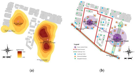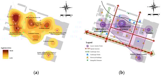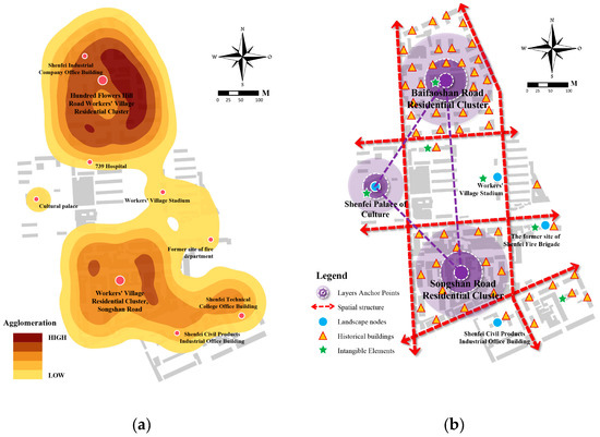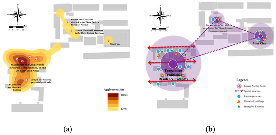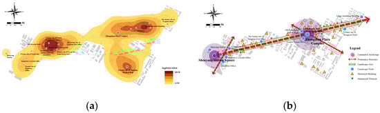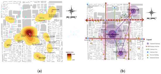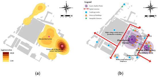 Analysis of layering patterns in the Zhaoxin Kiln Factory historic district: (a) kernel density analysis; (b) graphical analysis. (Source: drawing by W.Y.).