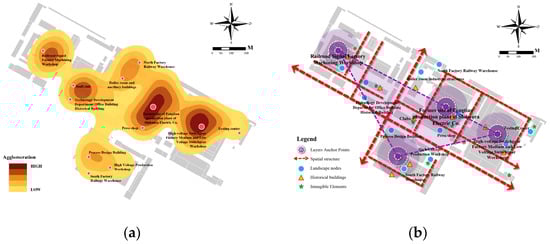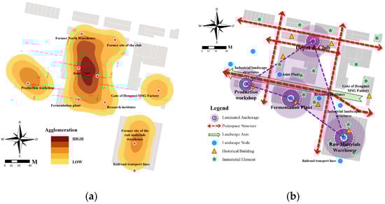 Analysis of layering patterns in the Hongmei MSG Factory historic district: (a) kernel density analysis; (b) graphical analysis. (Source: drawing by W.Y.).