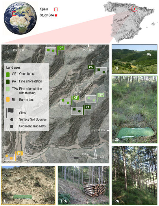 The study was conducted on representative slopes covered by different land uses: open forest (OF), pine afforestation (PA), and another slope section where thinning activities were carried out in the pine plantation during the study period (TPA), as well as barren, abandoned land (BL) with highly degraded bare soils (Figure 1). Representative samples from each land use were obtained through integrated soil sampling for each category. Open Mediterranean forest and afforested areas with pine were located on sandstones and mudstones, with Cambisols predominating, while most samples from barren land were collected in an area where mudstones and sandstones are the dominant lithology. At each site, surface soil samples (0–2 cm) were collected to characterize the layer contributing to the eroded soil supply. A total of 15 composite samples composed of five subsamples each were collected covering OF, PA, and BL. The amount of sediment collected under each land use was assessed throughout the different sampling campaigns, and the mean values were compared using a t-test and ANOVA.