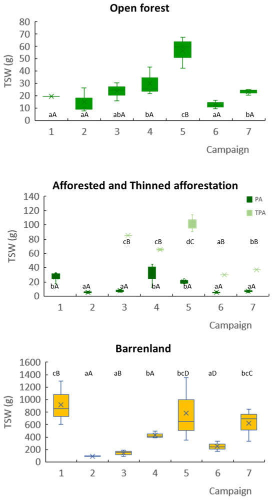 The amount of sediment recorded (TSW) in each campaign for each type of land use (open forest (OF), pine afforestation (PA), pine afforestation with thinning (TPA), and barren land (BL) (× represents the mean value and the lower and upper box limits represent the first and third quartiles, respectively). A different lowercase letter means significant differences at the 95% level between campaigns, and a different capital letter means significant differences between land uses.