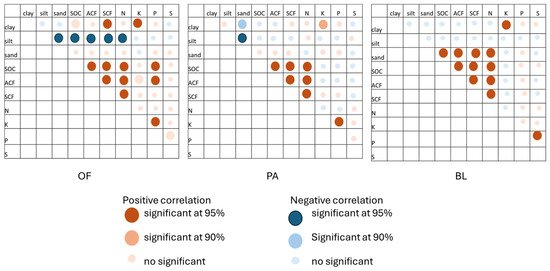The correlations between SOC, nutrient content, and soil particle size distribution in soils under different land uses are shown in Figure 3. A significant correlation was observed between clay and K (positive) and between N and SOC and its fractions (ACF and SCF) in all land uses. In OF, there was also a correlation between P and SOC and ACF, which did not appear in PA and BL. In addition, in OF and in PA there was a positive correlation between P and K, while in BL, P correlated with S.