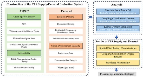 Urban green spaces play a crucial ecological role in urban environments []. As primary carriers of CES, they serve as important avenues for residents to access cultural services, contributing significantly to social well-being and environmental sustainability []. By enhancing CES, urban green spaces improve ecological functionality, strengthen green infrastructure, and bolster urban resilience []. However, as urban demand for CES continues to grow, the mismatch between CES supply and demand has become increasingly severe []. Existing studies have identified spatial disparities in CES distribution, where central urban areas and high-income districts tend to enjoy more cultural services, whereas peripheral areas and low-income communities often face inadequate CES supply []. Furthermore, in most urban regions, CES supply fails to meet demand, particularly in high-density areas, where demand for cultural services significantly exceeds availability []. Therefore, exploring the spatial coupling relationships of urban green space CES and addressing supply–demand mismatches is of great research significance and practical value. As a rapidly urbanizing country, China faces pronounced urban expansion challenges, making it imperative to incorporate balanced CES allocation into urban planning strategies [].