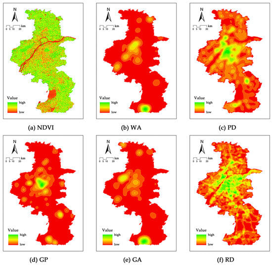 The distribution map of CES supply indicators for urban green spaces in Nanjing: (a) NDVI; (b) Water Area within 800 m of Parks; (c) Public Transportation Station Density; (d) Urban Park Green Space Distribution Points; (e) Park Green Space Area; (f) Road Network Density.