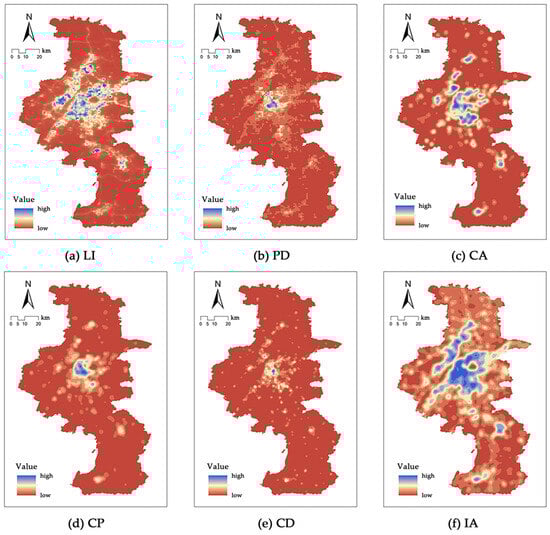 The distribution map of CES demand indicators for urban green spaces in Nanjing: (a) night light index; (b) population density; (c) residential community area; (d) residential community distribution points; (e) commercial POI density; (f) impervious area.