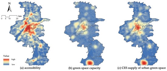 Spatial distribution of CES supply in urban green spaces in Nanjing: (a) accessibility; (b) green space capacity; (c) CES supply of urban green space.