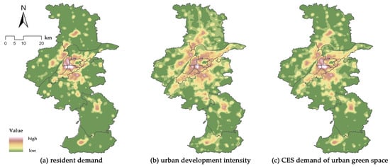 Spatial distribution of CES demand in urban green spaces in Nanjing: (a) resident demand; (b) urban development intensity; (c) CES demand of urban green space.