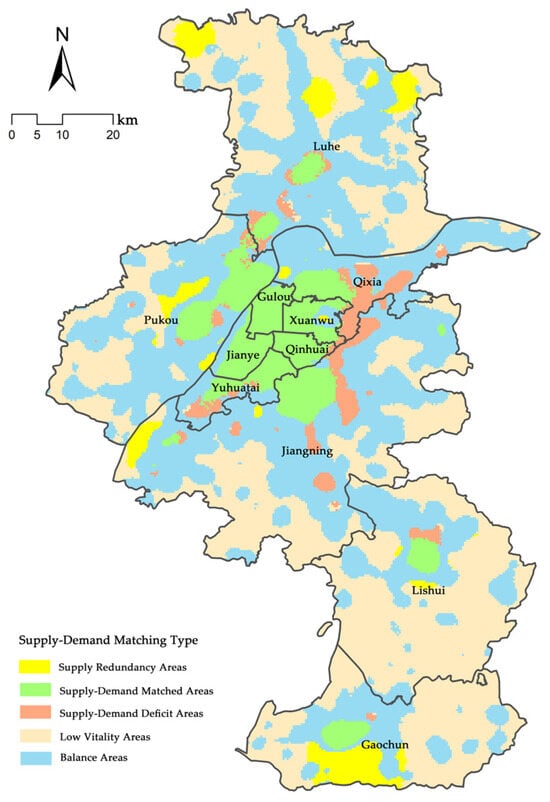 The supply–demand mismatch areas are divided into two types: supply redundancy areas and supply–demand deficit areas, which account for 4.14% and 3.66% of Nanjing’s total area, respectively. Supply redundancy areas are characterized by general coordination between supply and demand, with high supply–low demand, mainly distributed in regions with a good natural environment, such as the northern mountainous areas and areas near large water bodies in the south. Supply–demand deficit areas, at the same time, exhibit coupling disorder with low supply–high demand, and these areas are primarily concentrated on the eastern edge of the main urban area in Nanjing, extending outward. Some sub-center areas also face similar supply–demand mismatch problems.