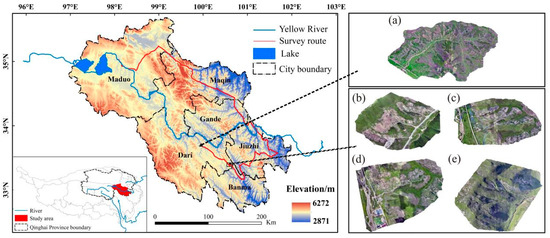 The Guoluo Tibetan Autonomous Prefecture (97°54′–101°50′ E, 32°31′–35°40′ N) is located in the southeastern part of Qinghai Province, with an area of 76,442 km2 [18,22] (Figure 1). The mean elevation exceeds 4200 m, and the climate is characterized by cold and severe conditions, with atmospheric oxygen levels at only 60% of those found at sea level [23]. The annual average precipitation is 540.9 mm, the annual average wind speed is 2.5 m/s, and the annual average temperature is −4 °C [23,24].